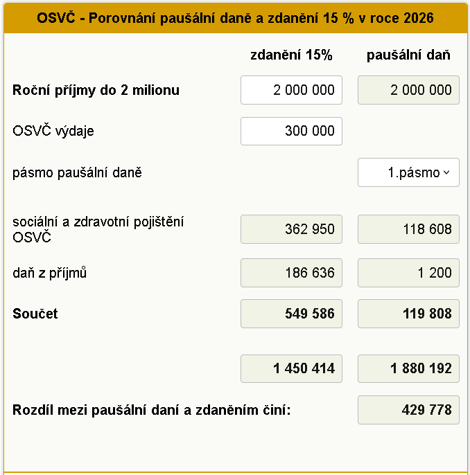 Sociální pojistné paušální daň: je určeno jako 29,2,% z výpočtového základu, který je u 1. pásma dán 35 % průměrné mzdy + 15 %, u 2. a 3. pásma je dán vyměřovací základ pevně