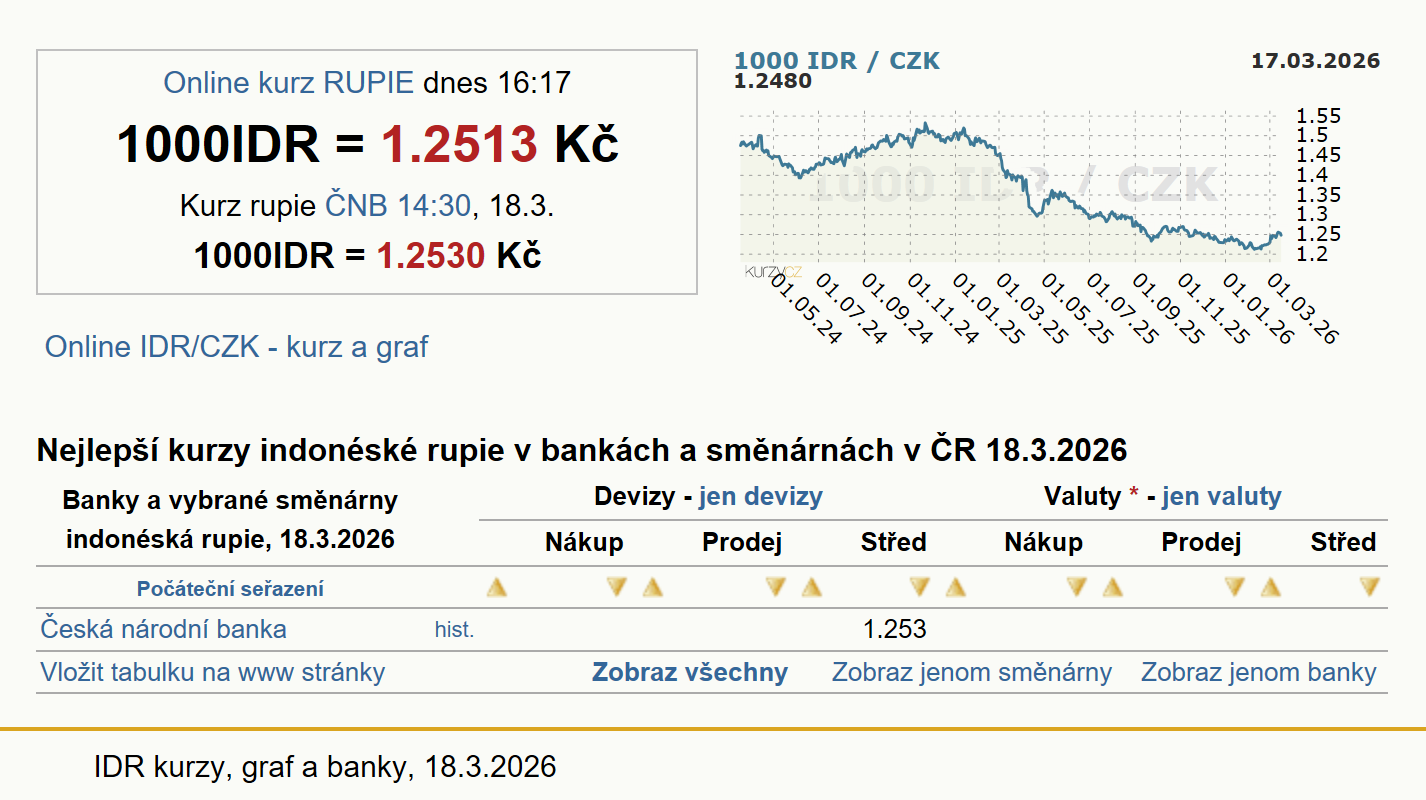 Podrobnější informace a průměrné kurzy ČNB jsou na stránce Historické kurzy indonéské rupie (IDR)