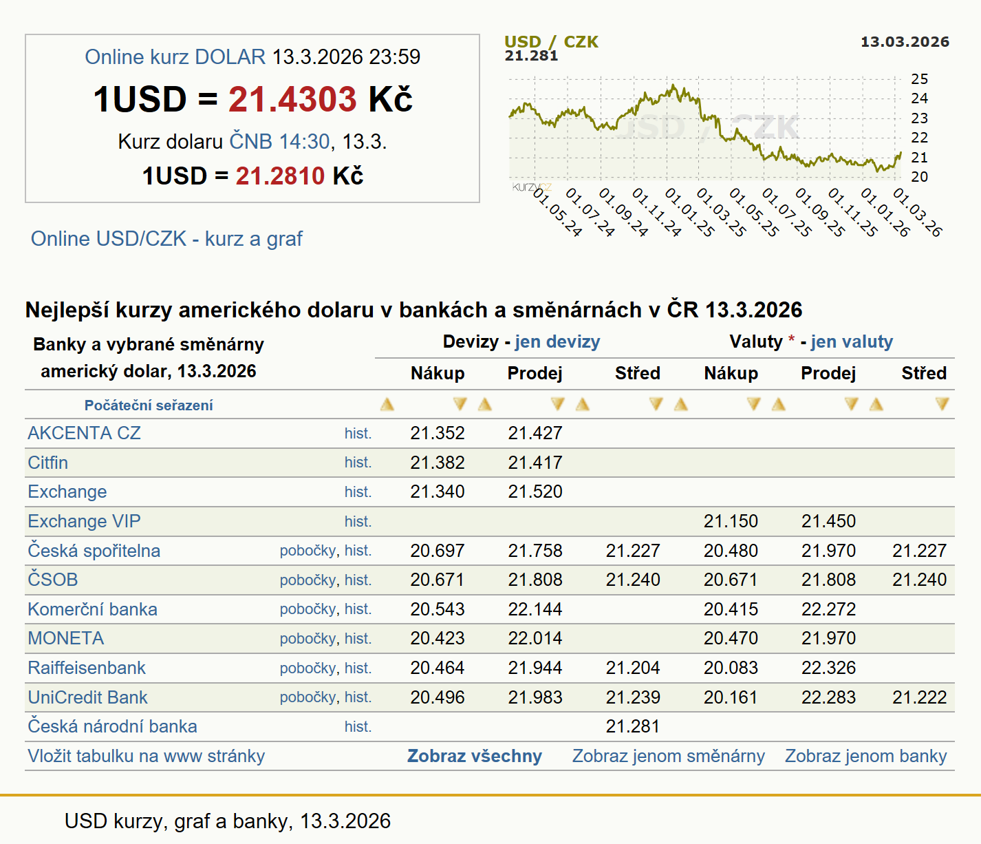 Banky a vybrané směnárny americký dolar, 13.2.2026 |