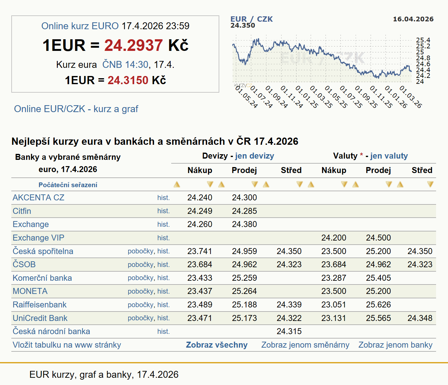 | Kurzy VISA | kurzovní lístek | Euro | 17.04.2026 | 24.290 | |