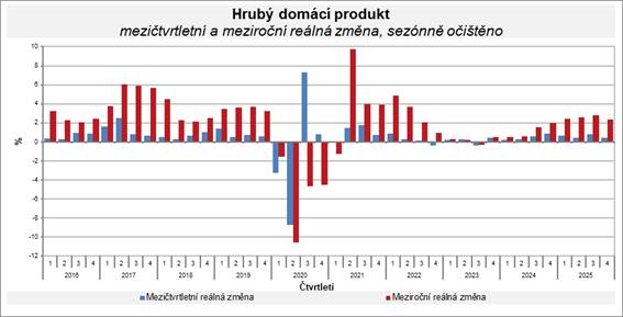 Hrubý domácí produkt vzrostl v roce 2025 podle předběžného odhadu o 2,5 %. Ve 4. čtvrtletí HDP vzrostl mezičtvrtletně o 0,5 % a meziročně o 2,4 %.