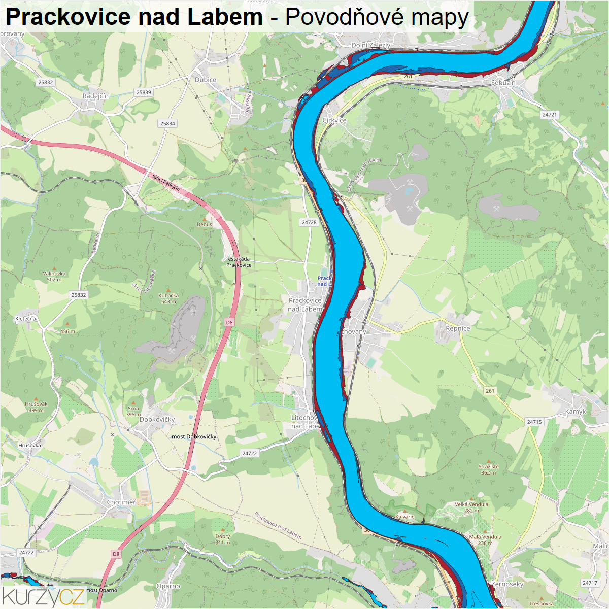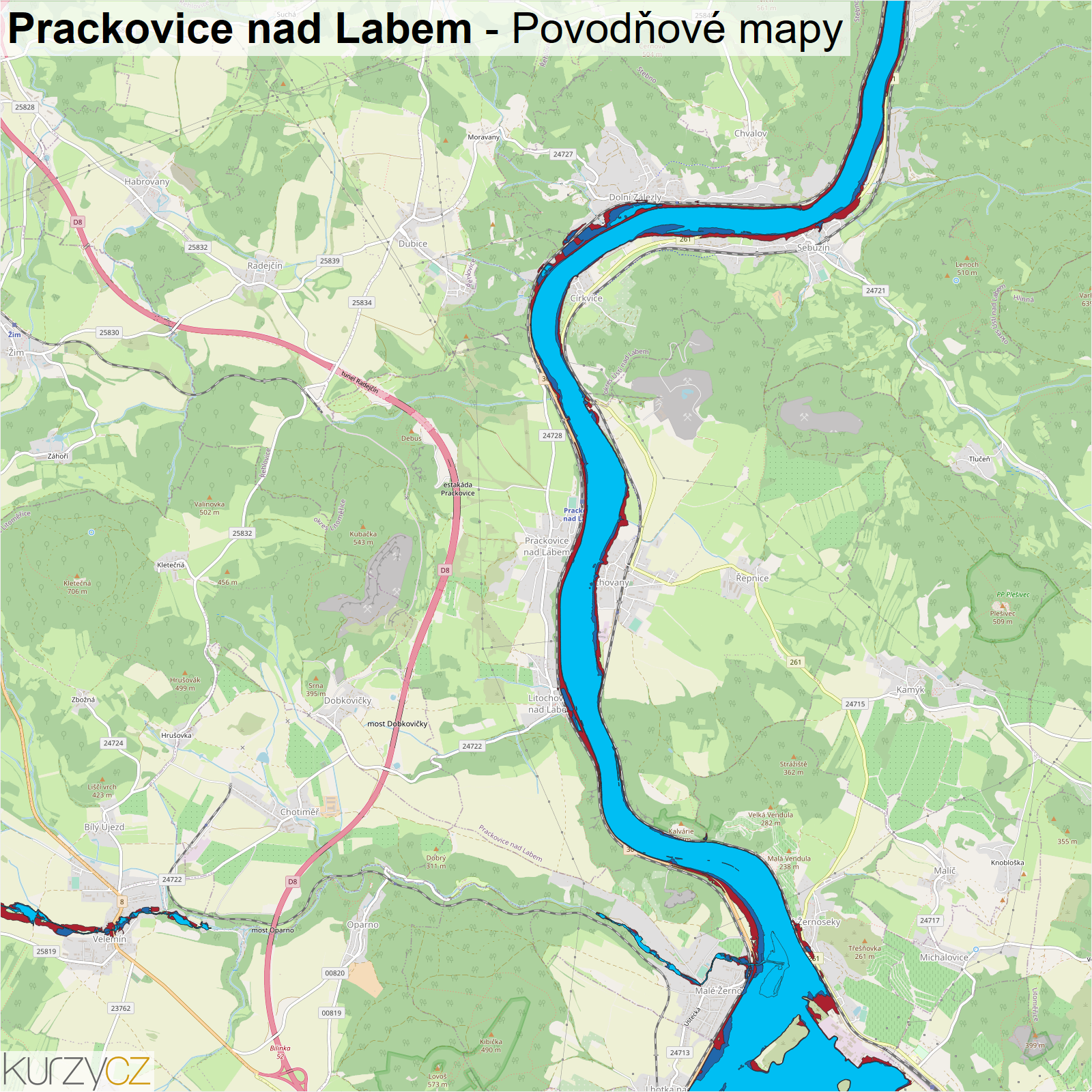 Záplavová mapa obce Prackovice nad Labem