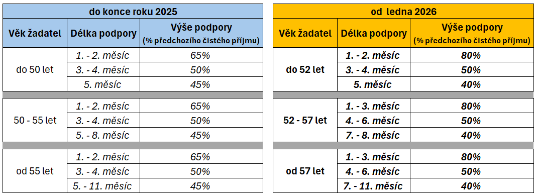 - Vyšší podpora v prvních měsících nezaměstnanosti (viz. tabulka níže) - podpora se zvyšuje v prvním období nezaměstnanosti na 80 % předchozího průměrného měsíčního čistého výdělku nebo vyměřovacího základu (v roce 2025 to bylo ve výši 65 %). Pro druhé období zůstává podpora na 50 % předchozího průměrného měsíčního čistého výdělku a ve třetím období dochází ke snížení z 45 % na 40 %.
